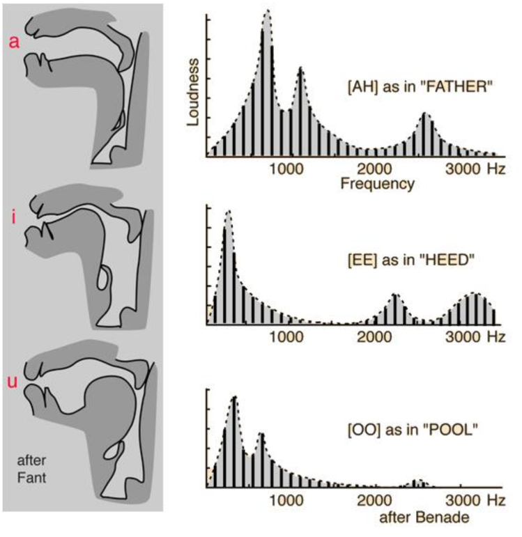 声源的振动信号通过声道时,声道本身也会发生共鸣,与声道共振频率相近的能量会被增强,远离声道共振频率的部分则会被衰减,从而谐波的能量就组成了一组高低起伏的形状包络,这些包络中的巅峰位置叫做共振峰